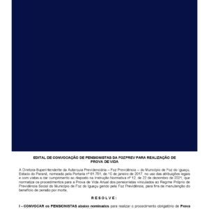 SINPREFI COMPARTILHA: EDITAL DE CONVOCAÇÃO DE PENSIONISTAS DA FOZPREV PARA REALIZAÇÃO DE PROVA DE VIDA A lista de pensionistas convocados, […]