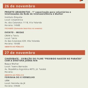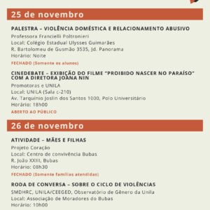 21 DIAS DE ATIVISMO PELO FIM DA VIOLÊNCIA CONTRA AS MULHERES Programações dias 26 e 27/11.