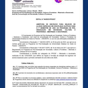 SINPREFI COMPARTILHA: ABERTURA DE INSCRIÇÃO PARA SELEÇÃO DE ALUNOS ESPECIAIS NO PROGRAMA DE PÓS- GRADUAÇÃO EM SOCIEDADE, CULTURA E FRONTEIRAS – MESTRADO E DOUTORADO UNIOESTE