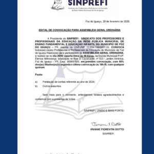 🔵ASSEMBLEIA ORDINÁRIA 🗓Dia 26/02/24 (QUARTA-FEIRA) ⏰18 horas ➡ESCOLA MUNICIPAL ELENICE MILHORANÇA 📍Rua Di Cavalcanti, nº 523, bairro América 🔹Pauta: a) […]