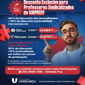 SINPREFI COMPARTILHA: Faculdade Uniguaçu – Desconto Exclusivo para Professores Sindicalizados do SINPREFI! Aproveite 40% de desconto nas mensalidades + 10% […]