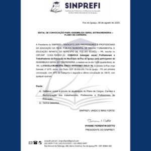 O SINPREFI convoca todos(as) os(as) trabalhadores(as) da Educação de Foz do Iguaçu para participarem da Assembleia Geral Extraordinária, que será […]
