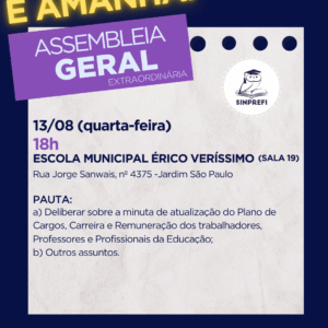 Hoje (13) o SINPREFI realiza Assembleia Geral Extraordinária, às 18h, na Escola Municipal Érico Veríssimo – Sala 19, localizada na […]