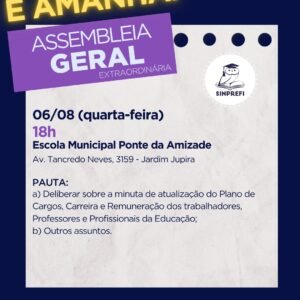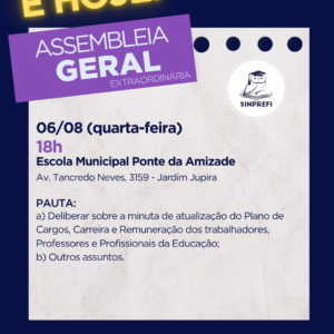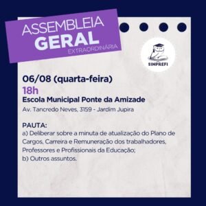 Nesta quarta-feira, 06 de agosto, o SINPREFI realiza uma Assembleia Geral Extraordinária, às 18h, na Escola Municipal Ponte da Amizade, […]
