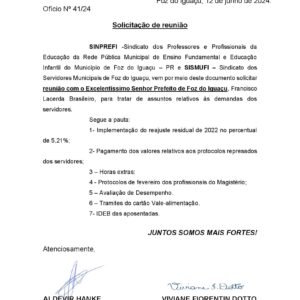 SINPREFI E SISMUFI, SOLICITAM NOVA REUNIÃO CONJUNTA DE NEGOCIAÇÃO COM O PREFEITO DE FOZ DO IGUAÇU, CHICO BRASILEIRO.