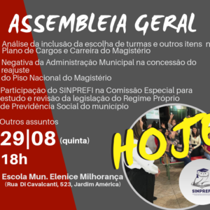 Na noite de ontem (29), foi realizada a Assembleia Geral Extraordinária do SINPREFI na Escola Municipal Elenice Milhorança, no Jardim […]