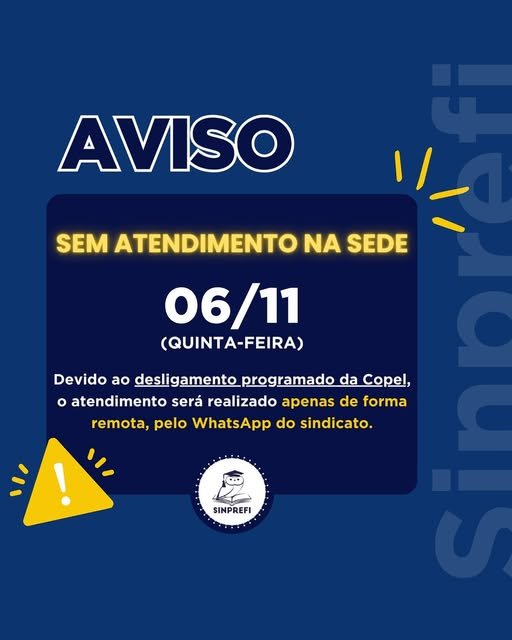 Nesta quinta-feira (06/11) não haverá atendimento presencial na sede do SINPREFI, devido ao desligamento programado da Copel. ⚡