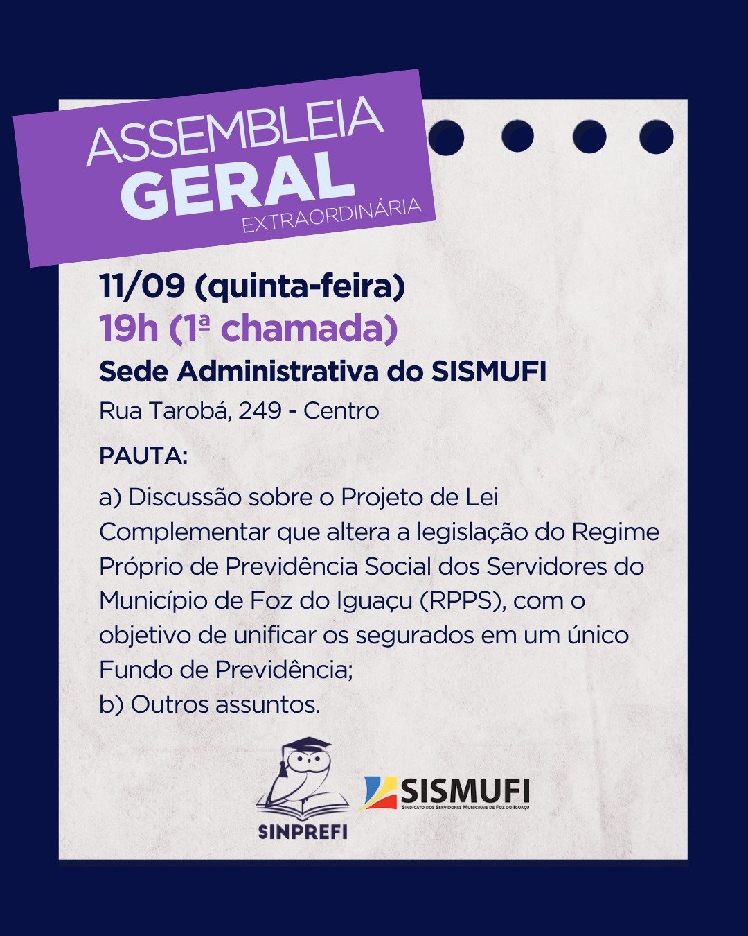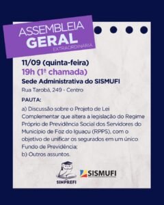 O SINPREFI e o SISMUFI convocam todos(as) os(as) servidores(as) municipais para participarem da Assembleia Geral Extraordinária!