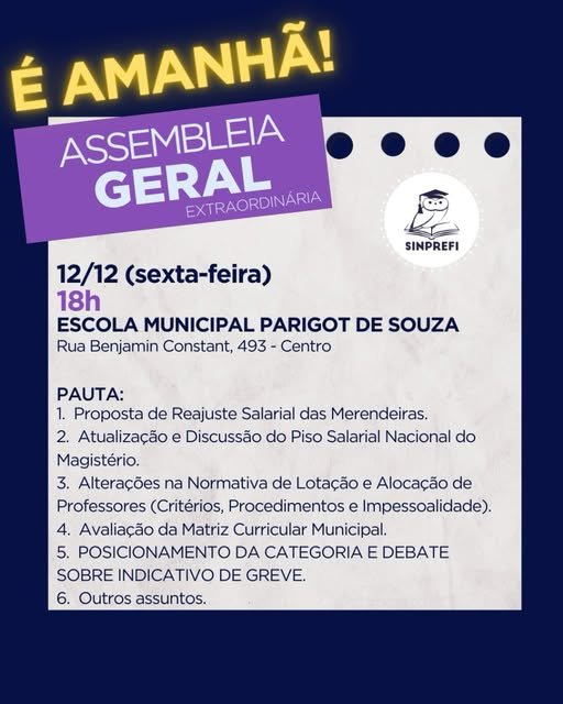 O SINPREFI convoca todos(as) os(as) trabalhadores(as) da Educação de Foz do Iguaçu para participarem da Assembleia Geral Extraordinária, que será realizada amanhã, sexta-feira (12/12), às 18h, na Escola Municipal Parigot de Souza (Rua Benjamin Constant, 493 – Centro).