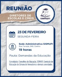 Na próxima segunda-feira (23), o Sinprefi realizará uma reunião com os diretores das escolas e dos CMEIs da rede municipal para debater as demandas da Educação e fortalecer a organização coletiva da categoria.