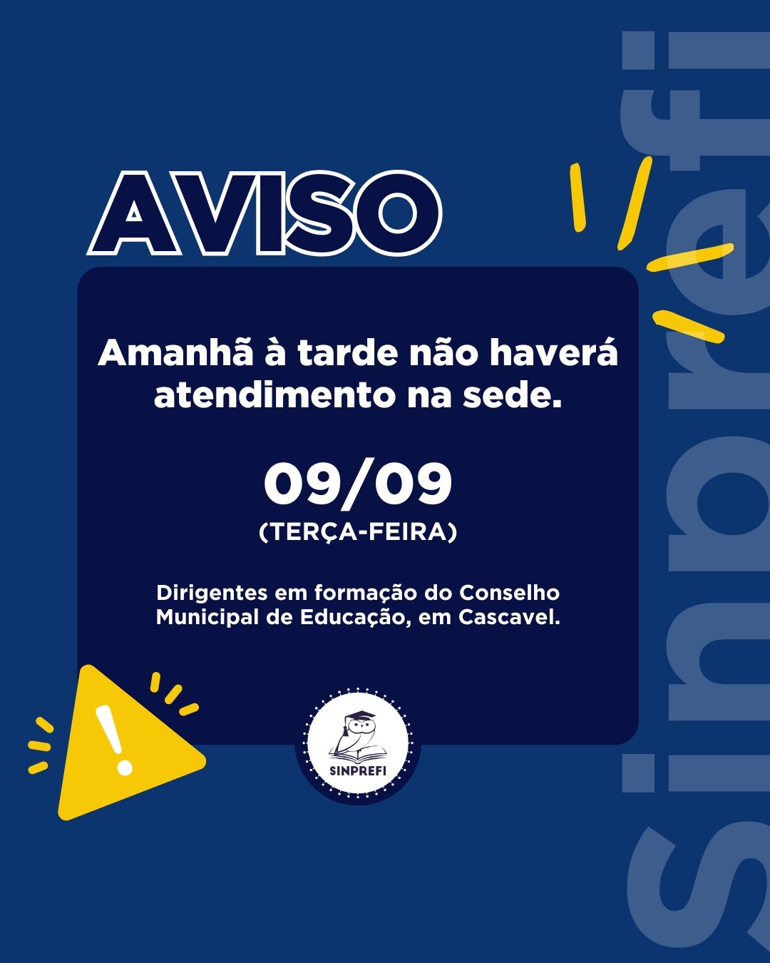 AVISO: NÃO HAVERÁ ATENDIMENTO NA SEDE 09/09 8 de setembro de 20259 de setembro de 2025 preferir Atenção, servidor(a)! Amanhã à tarde não haverá atendimento na sede, pois nossos dirigentes estarão em formação do Conselho Municipal de Educação, em Cascavel. XIV Seminário Estadual dos Conselhos Municipais de Educação III Seminário Estadual CACS FUNDEB Servidor(a), antecipe suas questões com o SINPREFI!