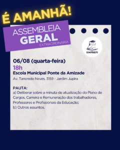 O SINPREFI convoca os(as) Professores e Profissionais da Educação de Foz do Iguaçu para participarem da Assembleia Geral Extraordinária que acontece amanhã, 06 de agosto (quarta-feira), às 18h, na Escola Municipal Ponte da Amizade – Av. Tancredo Neves, 3159 – Jardim Jupira.