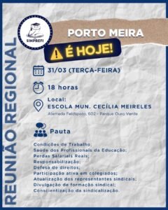 O Sinprefi convoca os profissionais da Educação da região do Porto Meira para participarem da Reunião Regional que acontecerá amanhã, terça-feira (31), às 18h, no Escola Municipal Cecília Meireles.