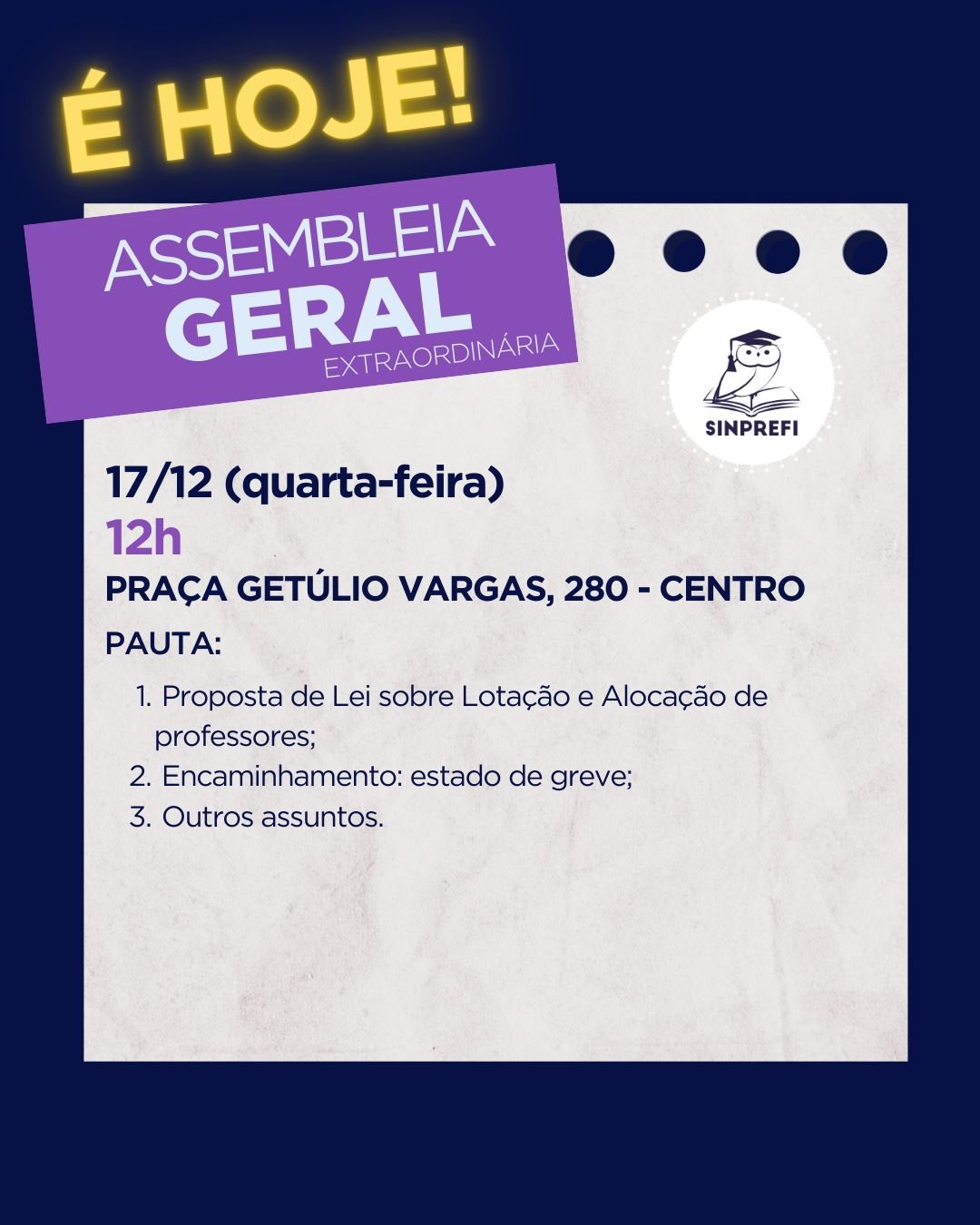 O SINPREFI convoca todas(os) as(os) servidoras(es) da Educação Municipal para participarem da Assembleia Geral Extraordinária, que acontece hoje.