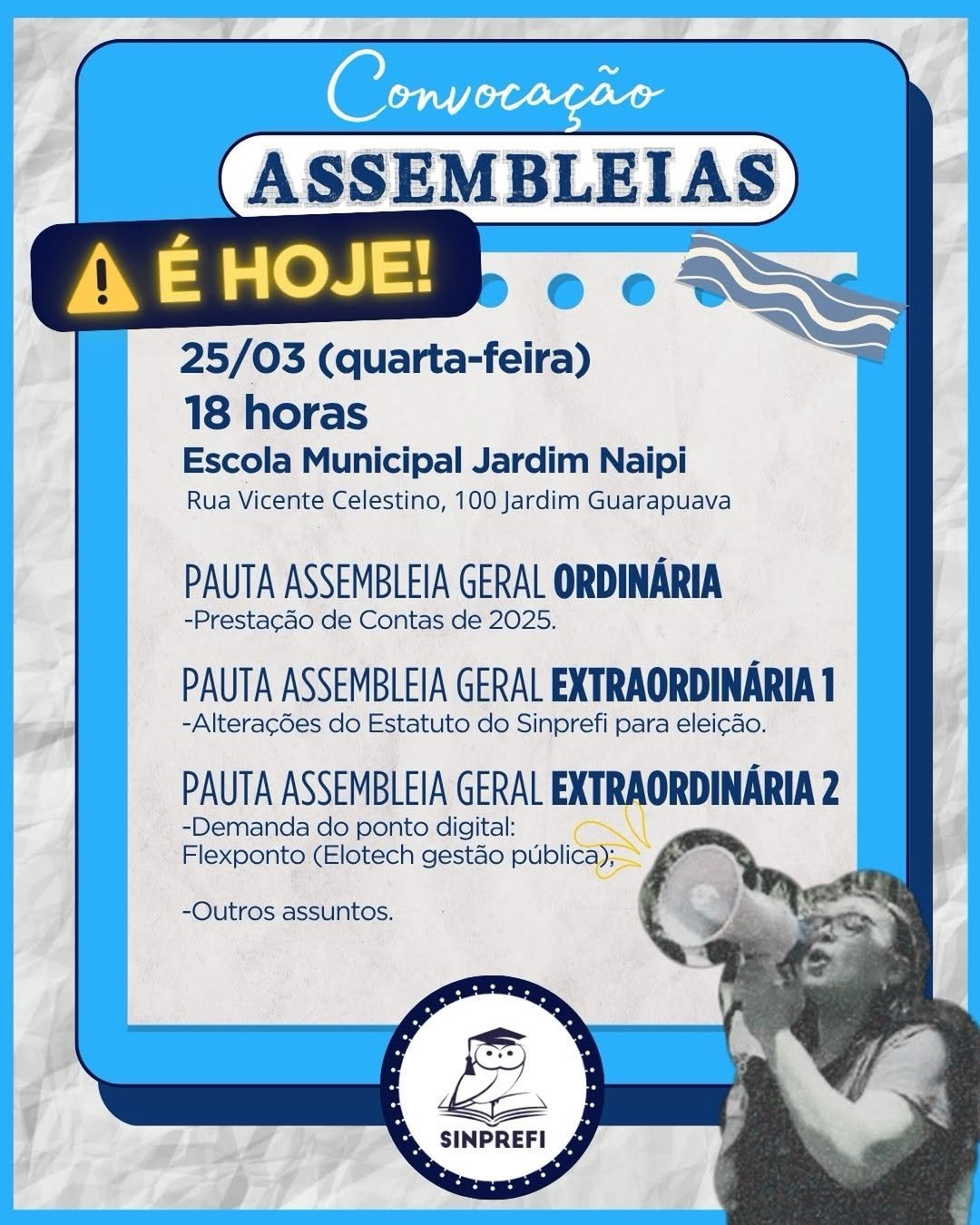 É HOJE! ASSEMBLEIAS DO SINPREFI 25 de março de 202631 de março de 2026 preferir Profissional da educação, chegou o momento de participar e fazer parte das decisões da sua categoria. 25/03 (quarta-feira) 18h Escola Municipal Jardim Naipi Na pauta: Prestação de contas de 2025 Alterações no Estatuto para eleição Ponto digital (Flexponto) / condições de trabalho Outros assuntos Sua presença é fundamental.