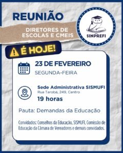 Hoje, às 19h, o Sinprefi realiza a reunião com os diretores das escolas e CMEIs para discutir pautas fundamentais e definir encaminhamentos importantes para a categoria.