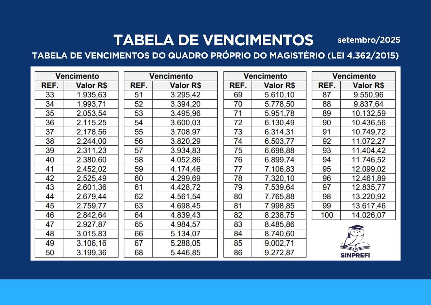 Confira nova Tabela de Referências do Magistério, com correção conforme publicado em Diário Oficial do dia 08/09.