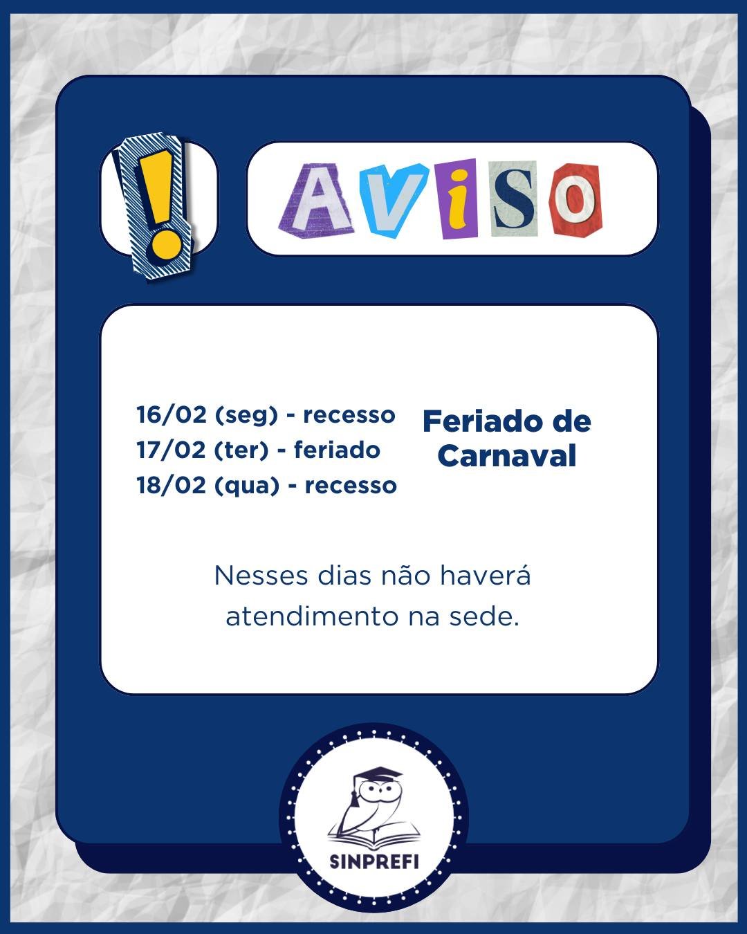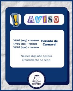Nos dias 16, 17 e 18 de fevereiro, não haverá atendimento na sede do Sinprefi devido ao recesso prolongado de Carnaval.