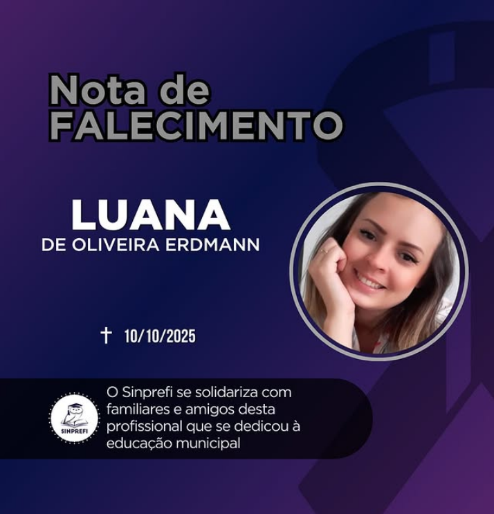 O Sinprefi lamenta a partida da professora Luana de Oliveira Erdmann e informa que o velório está sendo realizado na Capela Nossa Senhora do Rosário (Rua Maringá, 68 – Jd. Paraná). O sepultamento será no período da tarde, no cemitério central São João Batista.