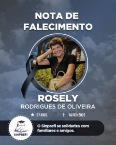 A Diretoria do Sinprefi manifesta profundo pesar pelo falecimento da professora aposentada e filiada ao sindicato, Rosely Rodrigues de Oliveira, ocorrido no sábado, dia 14 de março.