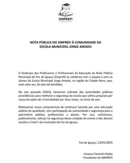 NOTA PÚBLICA DO SINPREFI À COMUNIDADE DA ESCOLA MUNICIPAL JORGE AMADO 13 de janeiro de 202514 de janeiro de 2025 preferir