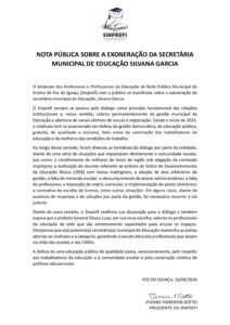 O Sindicato dos Professores e Profissionais da Educação da Rede Pública Municipal de Ensino de Foz do Iguaçu (Sinprefi) vem a público se manifestar sobre a exoneração da secretária municipal de Educação, Silvana Garcia.