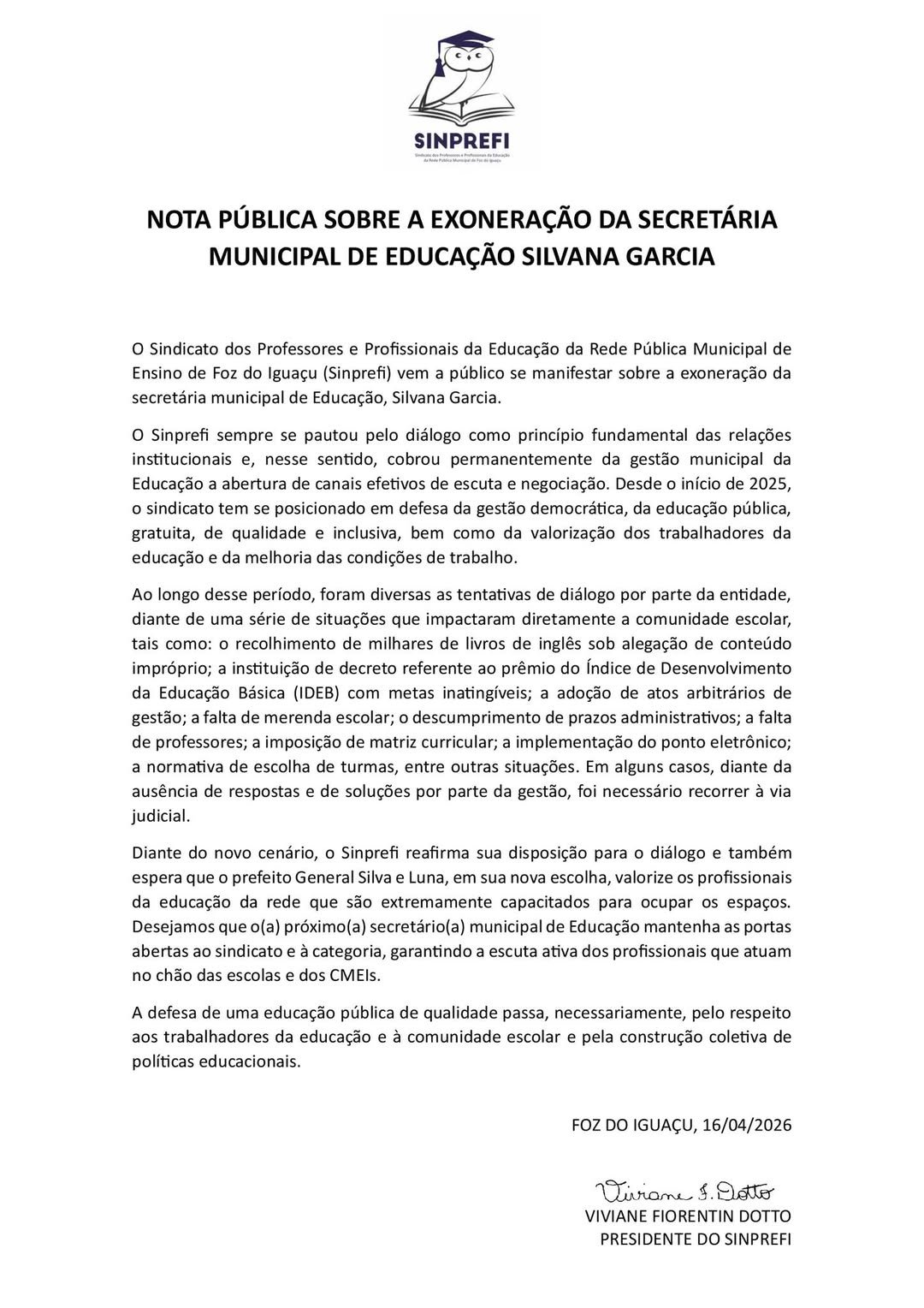 NOTA PÚBLICA SOBRE A EXONERAÇÃO DA SECRETÁRIA MUNICIPAL DE EDUCAÇÃO SILVANA GARCIA
