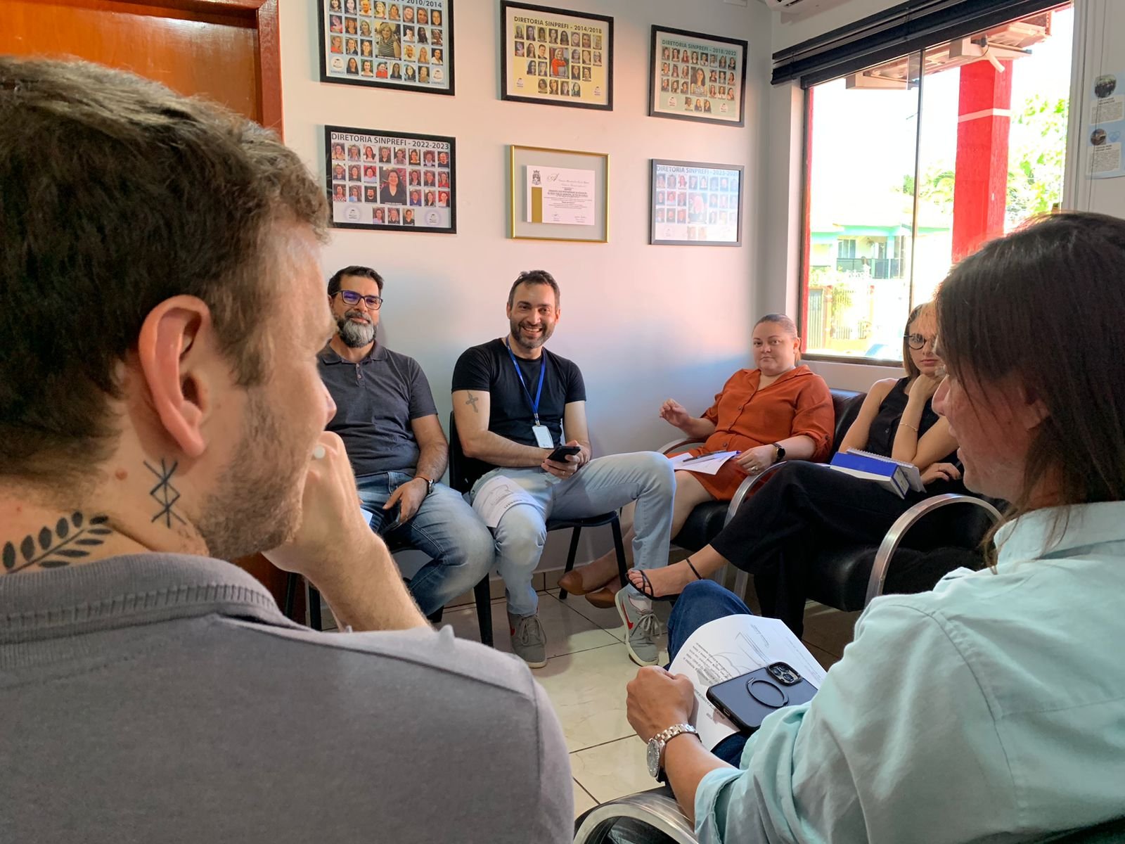 Nesta terça-feira (11), a presidente do Sinprefi, Viviane Fiorentin Dotto, juntamente com o secretário-geral do sindicato, Lucas Fávero, a tesoureira Elaine Cardoso Teotônio, a diretora de patrimônio, Simone Rejane dos Santos e a assessora jurídica, Dra. Solange da Silva, receberam na sede do sinprefi, a equipe que compõe a Diretoria de Saúde Ocupacional (Diso) da Prefeitura Municipal de Foz do Iguaçu.