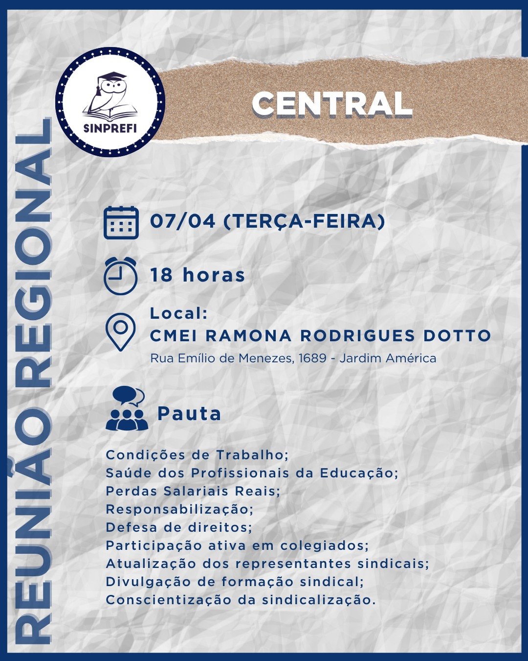 O Sinprefi convoca os profissionais da Educação da região Central para participarem da Reunião Regional, que será realizada:
