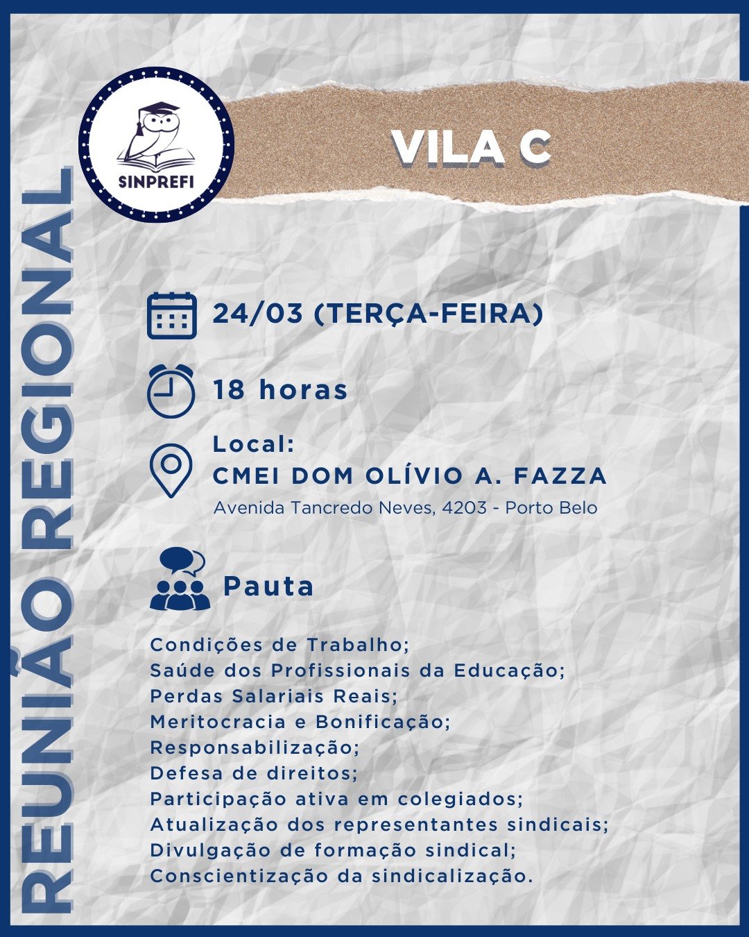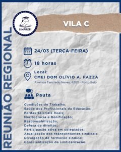 O Sinprefi convoca os profissionais da Educação da região da Vila C para participarem da Reunião Regional que acontecerá na próxima terça-feira (24), às 18h, no CMEI Dom Olívio Aurélio Fazza.