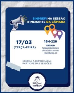 O Sinprefi reforça o convite para participar da Sessão Itinerante da Câmara de Vereadores, que será realizada no dia 17 de março (terça-feira), no Porto Meira.