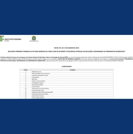 Para garantir sua matrícula no curso promovido pelo Instituto Federal do Paraná: “Inteligência Artificial na Educação: Desvendando as Ferramentas Generativas”, pedimos que confirme sua participação respondendo ao e-mail enviado pela Comissão do Processo Seletivo até a data de 21/01/2025. Não perca a oportunidade de aprimorar seu conhecimento e explorar novas ferramentas e tecnologias que enriquecerão sua prática docente! 📚📖💻🚀