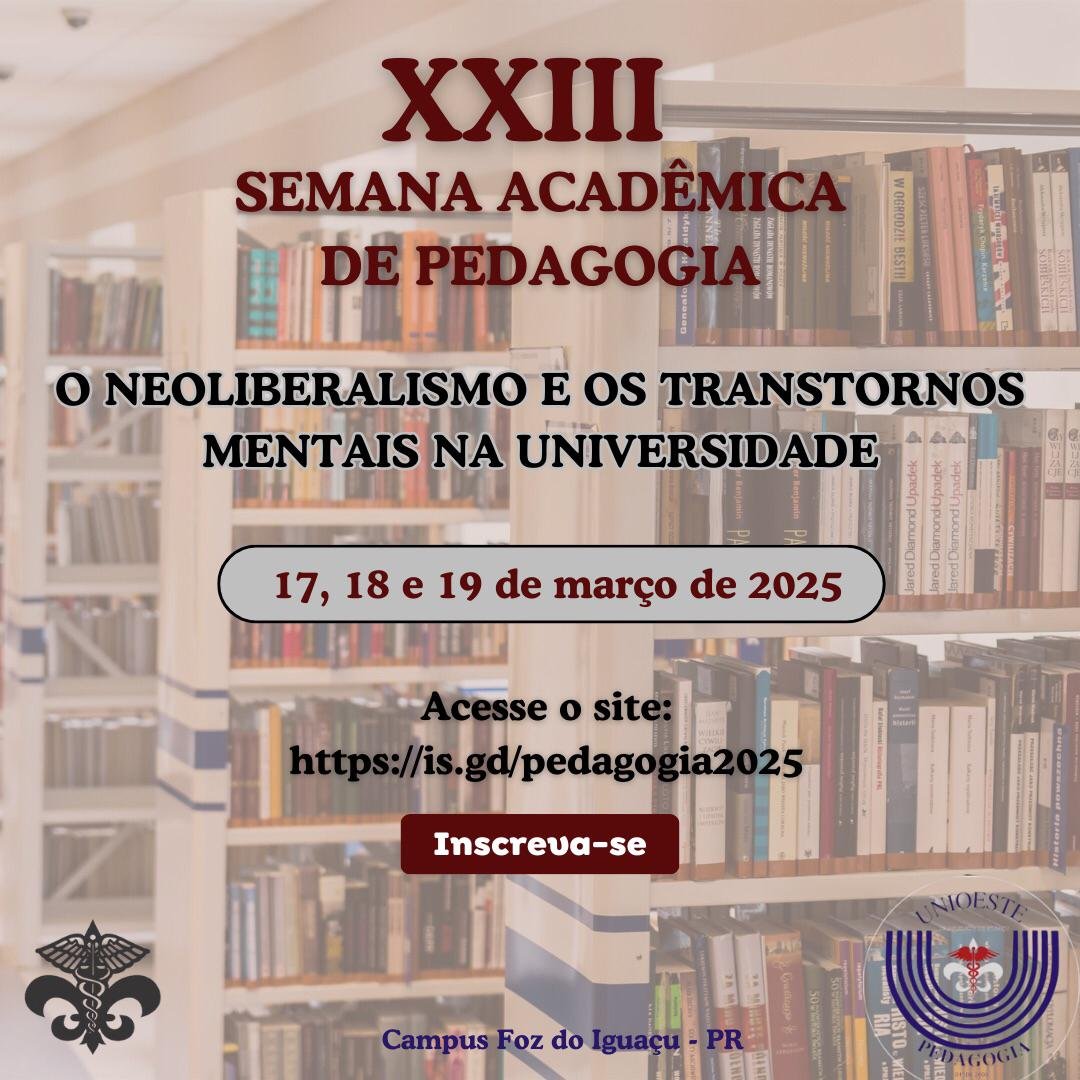 📚 A XXIII Semana Acadêmica de Pedagogia – Unioeste, Campus de Foz do Iguaçu, acontece de 17 a 19 de março, com o tema “O neoliberalismo e os transtornos mentais na Universidade”.