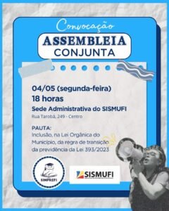 A assembleia terá como pauta tema estratégico e de grande relevância para a categoria: a inclusão, na Lei Orgânica do Município, da regra de transição da previdência prevista na Lei nº 393/2023.