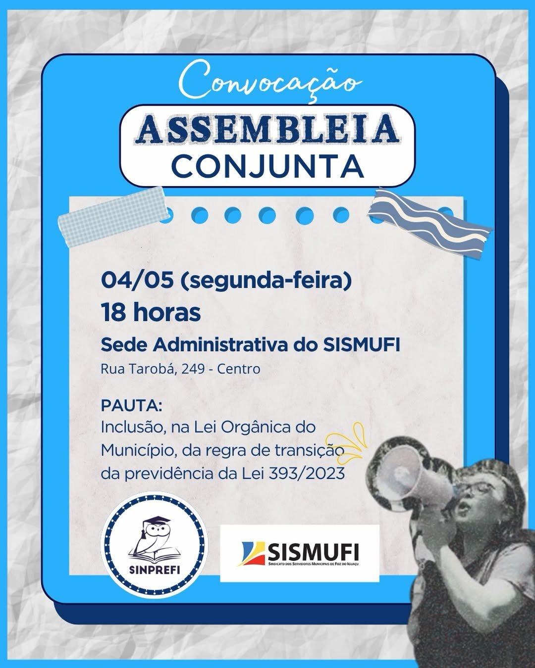 O SINPREFI convoca todos os servidores da Educação da Rede Municipal de Ensino para participarem da Assembleia Conjunta com o SISMUFI, que será realizada no dia 04 de maio (segunda-feira), na Sede Administrativa do SISMUFI.